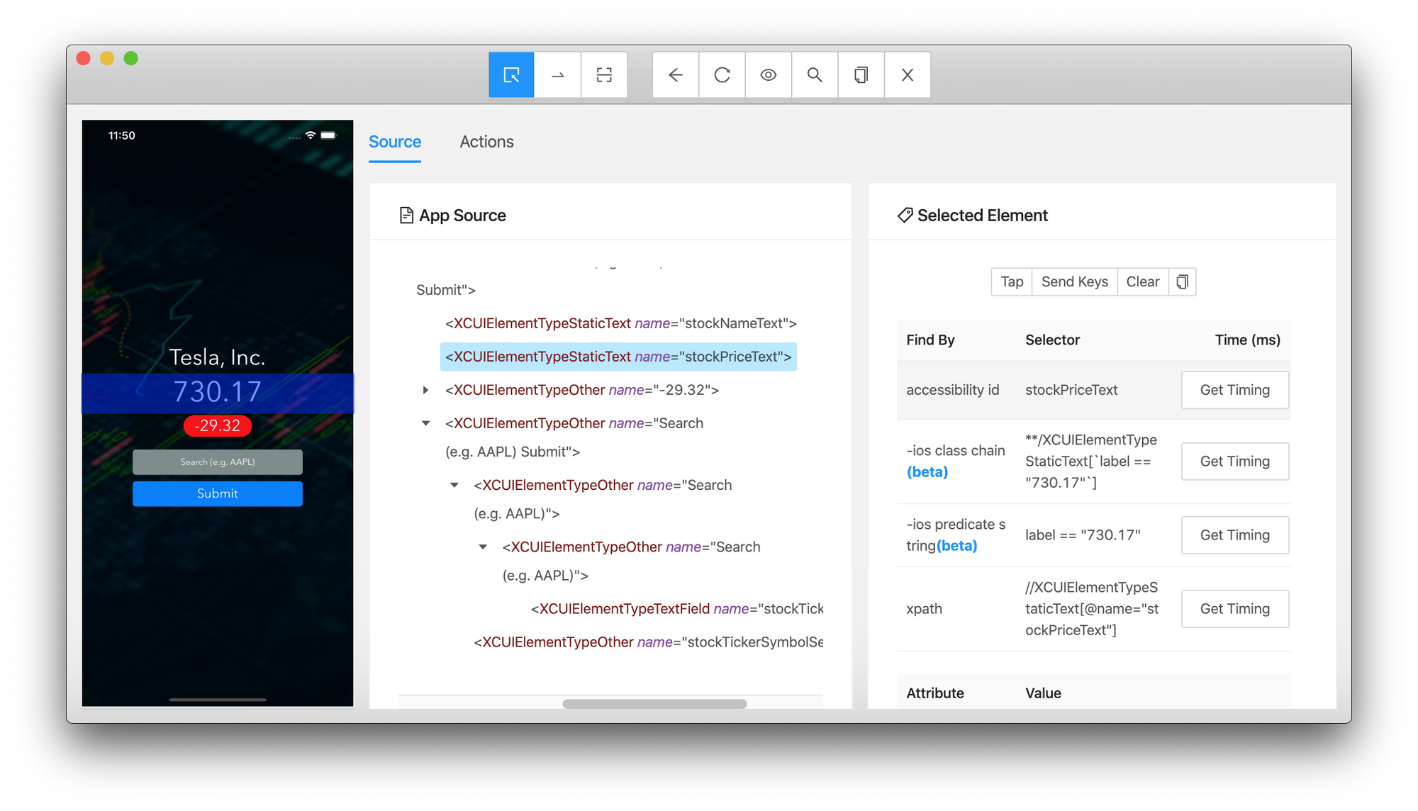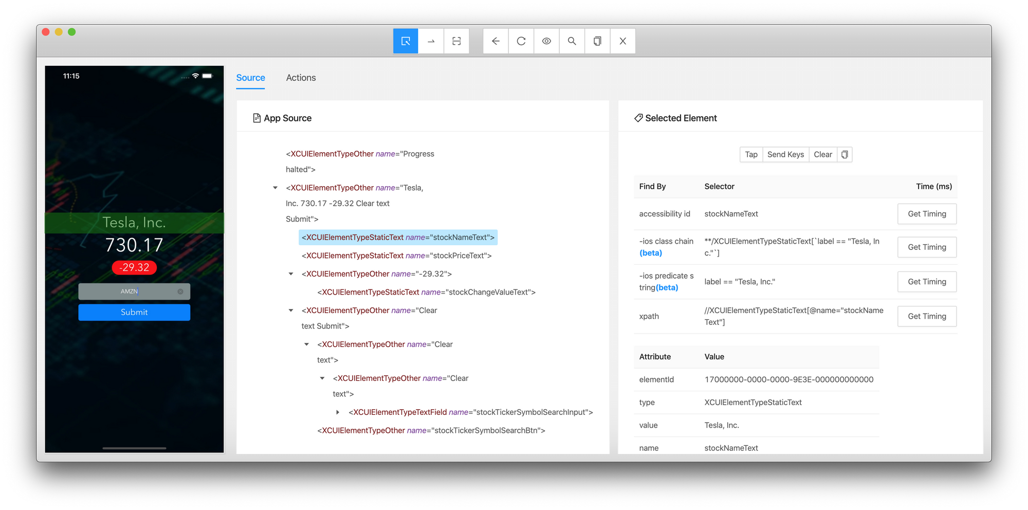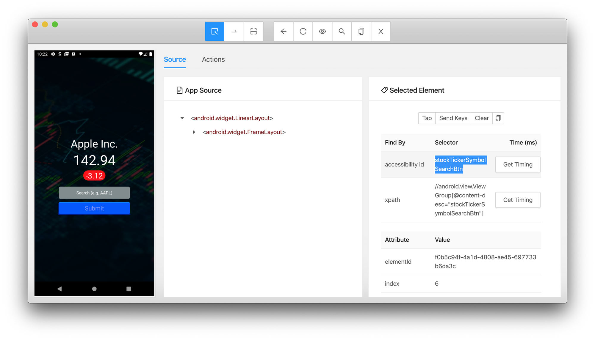 This will launch an inspector session for our app. This gives us the ability to interactively explore the view hierarchy of our app to determine the optimal locator strategies, and their associated selectors, before we formally write our automation tests. Go ahead and inspect our app! You’ll see that our test identifiers appear as expected.