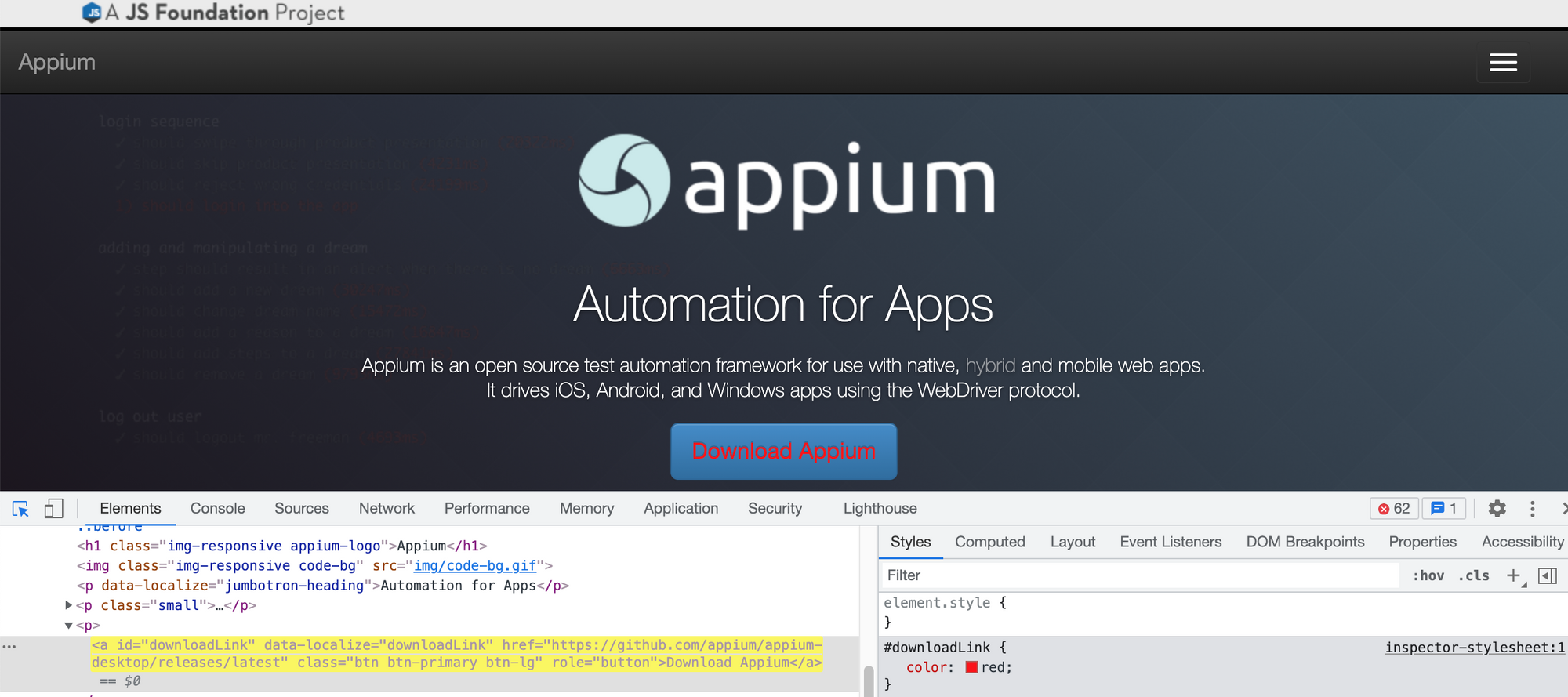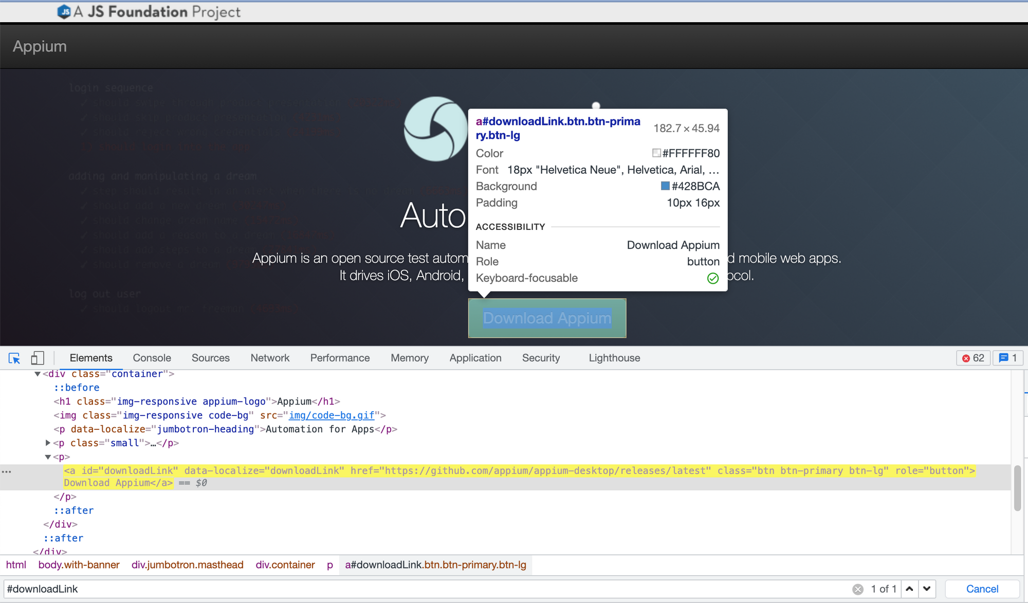 As an example in our analogy, if you navigate to http://appium.io in your browser and open up your browser’s developer tools, we can find the “Download Appium” button link by its element ID, which is “#downloadLink” by inspecting the button.