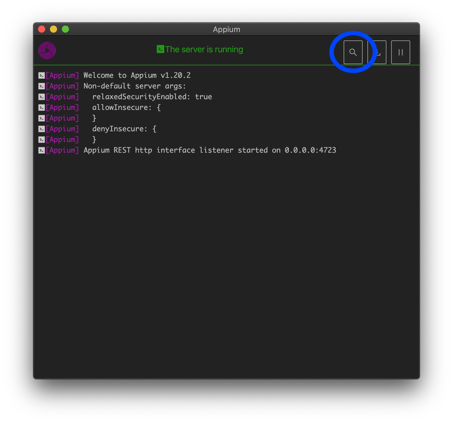 Launch Appium Desktop application on your computer and click on the “Start Server” button when the Appium window appears. This will start Appium Server locally on your machine. Click on the magnifying glass icon at the top right side, which will start an inspector session.