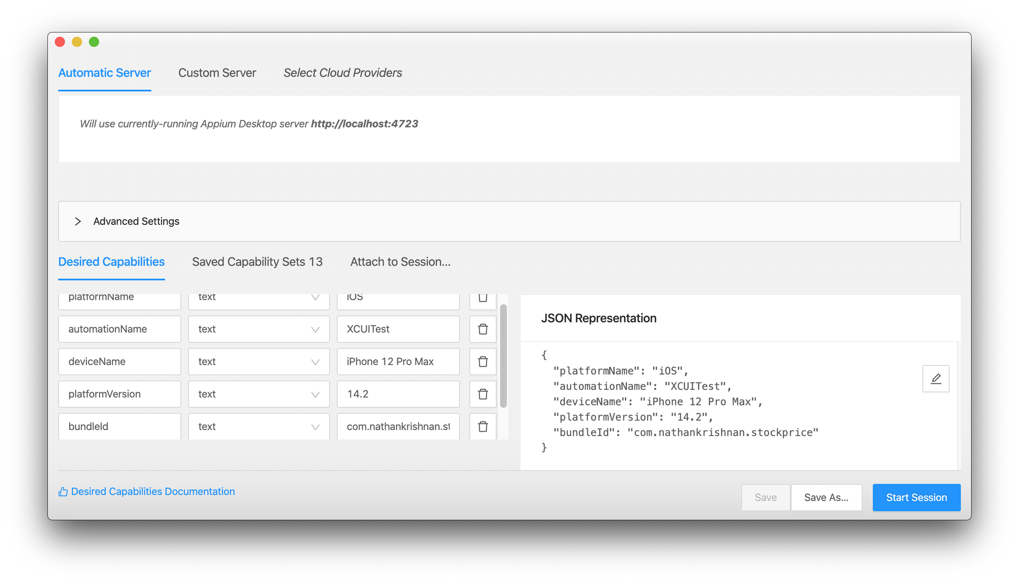 We’ll first start with inspecting our iOS app. To do this we’ll provide the following desired capabilities: